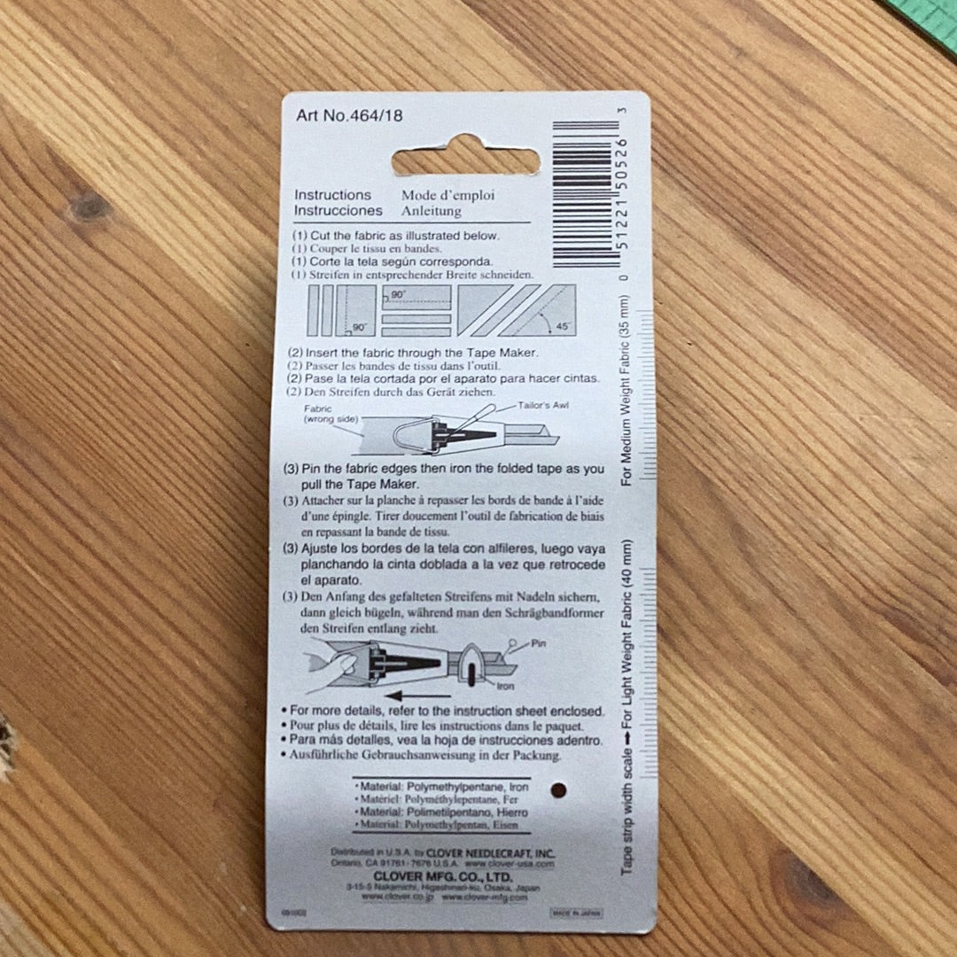 Clover Bias Tape Maker 18mm makes great looking bias tapes that come out very uniform in size! You can make your own tape for a fraction of the cost of buying ready made and use whatever fabric that looks best with your project. The package back has a tape strip width scale for both thin and regular fabric. Easily create bias tapes for Celtic, stained glass quilting, binding and other projects. Instruction sheet included. Don't be limited to the plain binding tapes in the shops. Quickly and simply make your own pretty binding in your choice of fabric with this easy to use gadget. Perfect for making binding for the tops of your bags and pockets. Also great for making fabric straps and ties for lacing. For speedy tape making simply cut your fabric to double the width of the tape maker, pass the fabric strip through the maker, and iron the folds. we also recomend the Clover Mini Iron for use with this tape maker