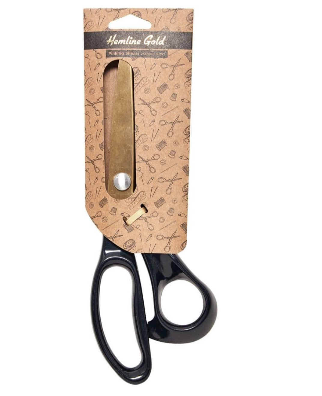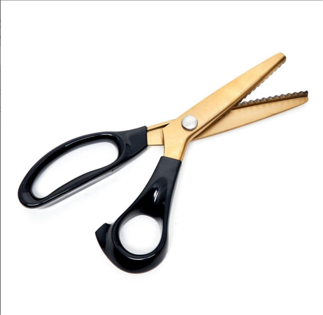 Brushed Gold Stainless Steel blades with ergonomic handles for comfort.  Able to cut through multiple layers of fabric and creates neat pinked edges to minimise fraying.