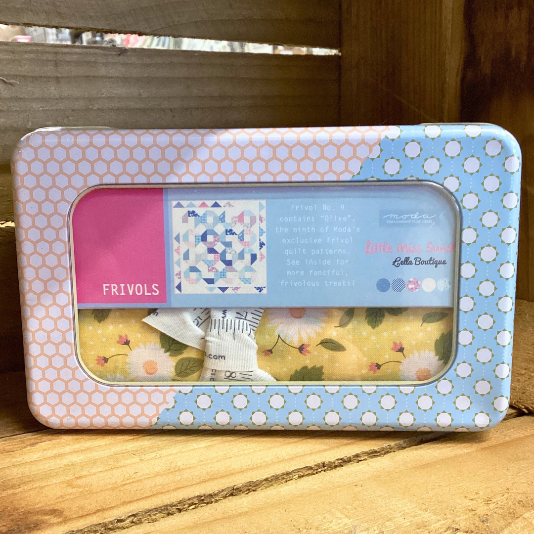 Moda Fabric Frivols No.9 - Little Miss Sunshine by Lella Boutique is a patchwork project in a tin, providing all you need for creating beautiful patchwork. It includes fabric sets, instructions, and a gorgeous tin for storage.