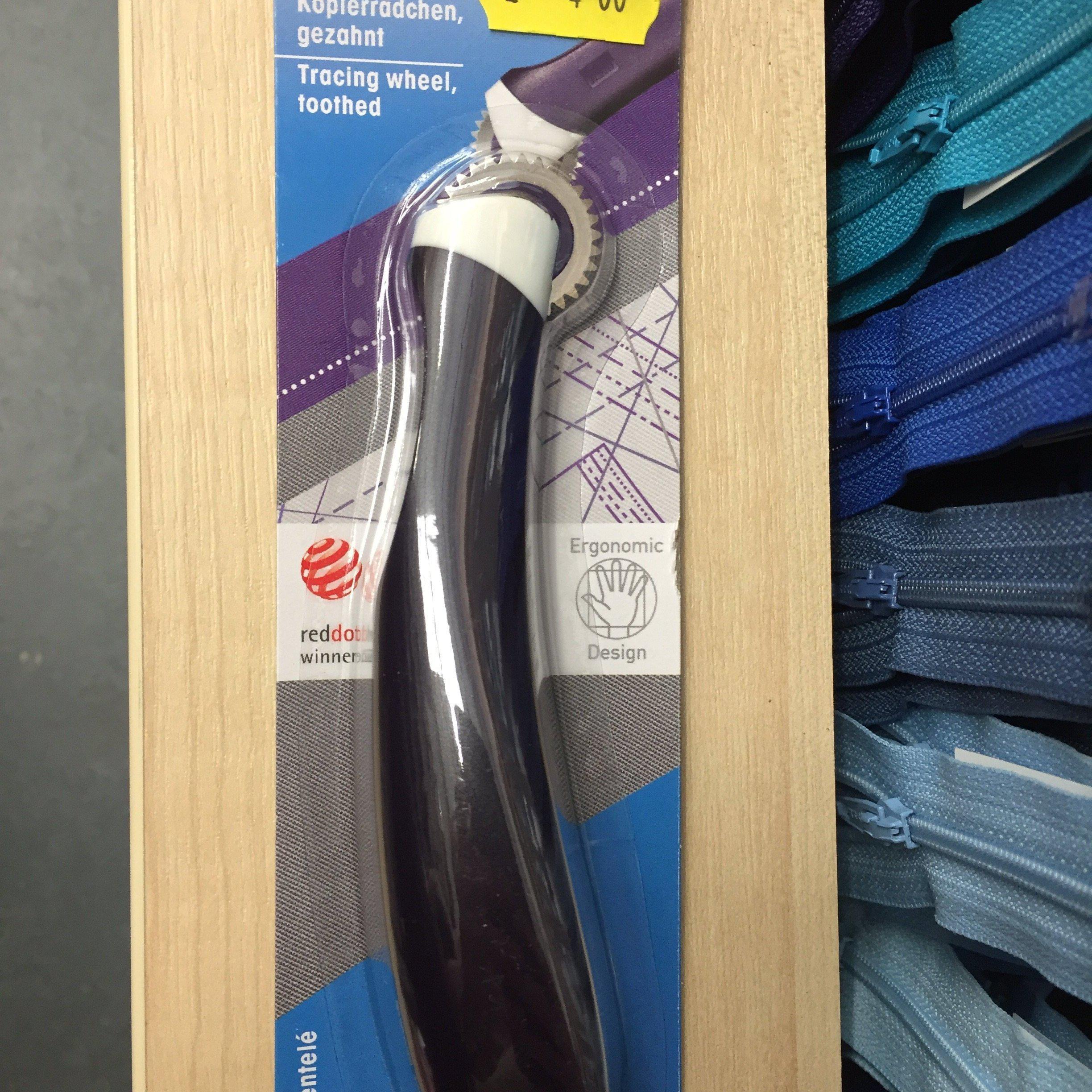 Enjoy fatigue-free working with the help of this fantastic Prym tracing wheel toothed for drawing dotted lines or transfer patterns on dressmaker's pattern paper or fabric. The product has a fantastic ergonomic design is slender for easy storage and a curved form with settled index finger rest. The Prym tracing wheel comes with foam-backed nylon covering that ensures easy pinning and marking. Also, its wheels are designed for quiet and smooth operation and runs effortlessly on every line.