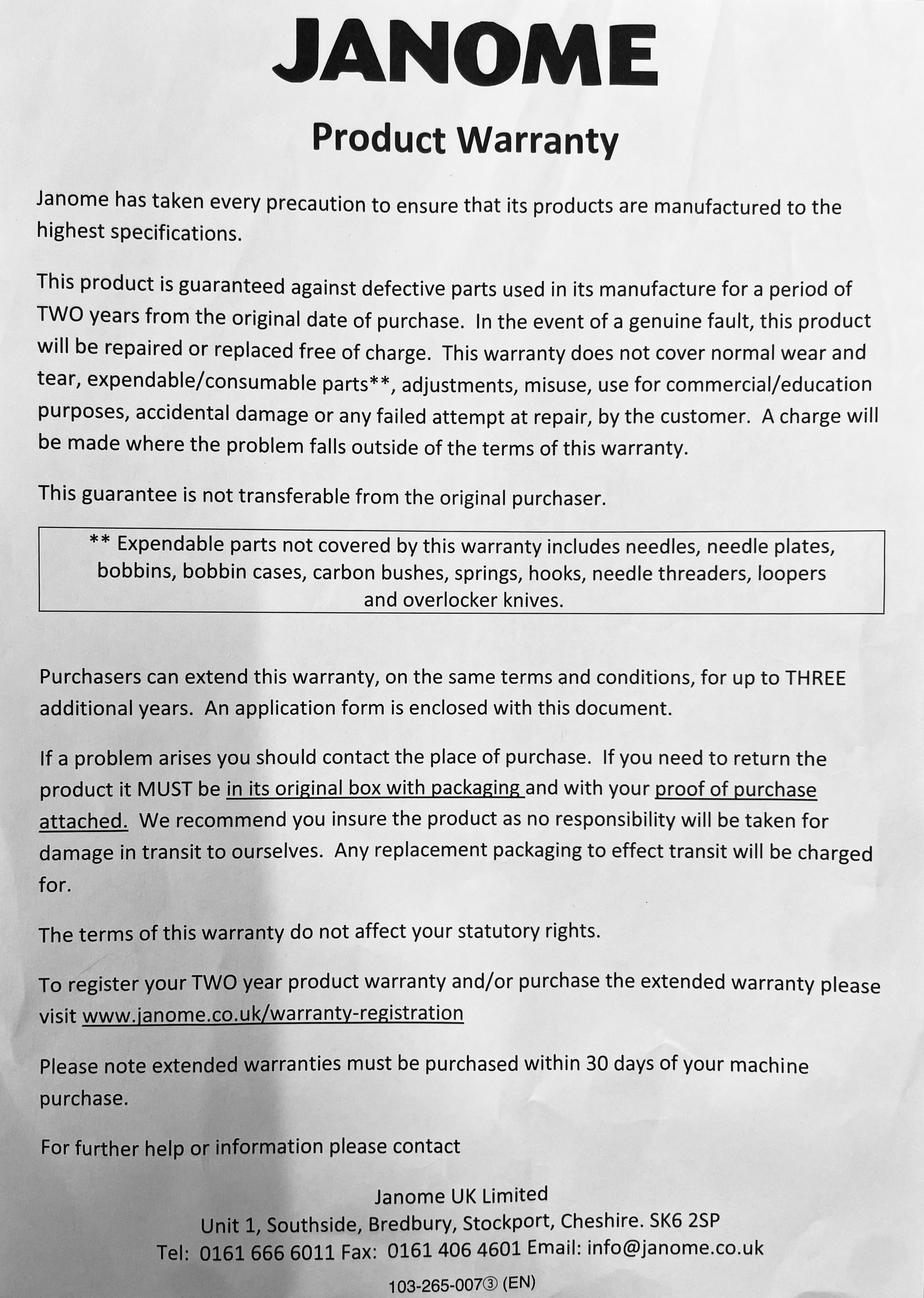 - Adjustments (Tension & Timing - done within you maintenance Service not under warranty)